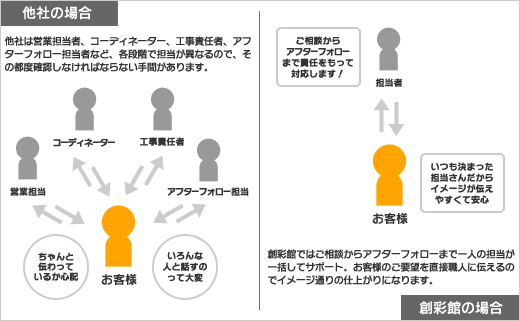 ご相談からアフターサービスまで担当者が変わりません。1人の担当者が打ち合わせから工事の現場管理もしておりますので工事の詳細が職人に伝わりやすいのです。